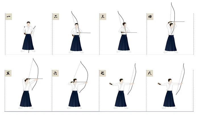 Kyūdō is defined by the hassetsu, or “Eight Stages of Shooting.” These steps break down the process of drawing and releasing the bow into clear, focused movements.